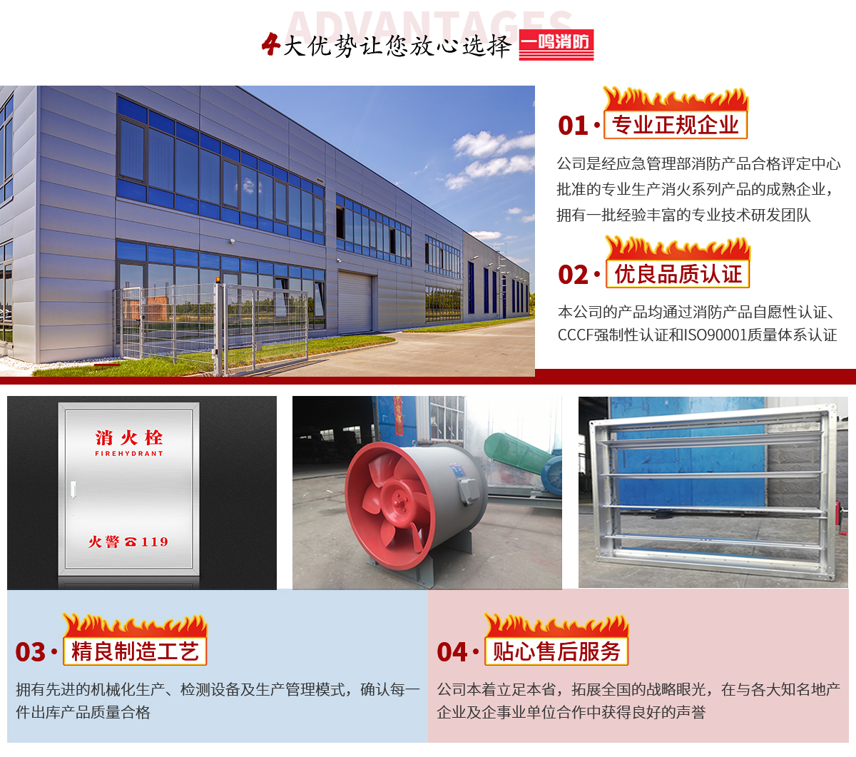 - 合肥一鳴消防設(shè)備有限公司是經(jīng)應(yīng)急管理部消防產(chǎn)品合格評定中心批準的專業(yè)生產(chǎn)消火栓箱系列、消防風機系列、防火閥排煙閥系列、風管系列、不銹鋼消防箱及配電箱柜系列等產(chǎn)品的成熟企業(yè),本公司的產(chǎn)品均通過消防產(chǎn)品自愿性認證、CCCF強制性認證和ISO90...